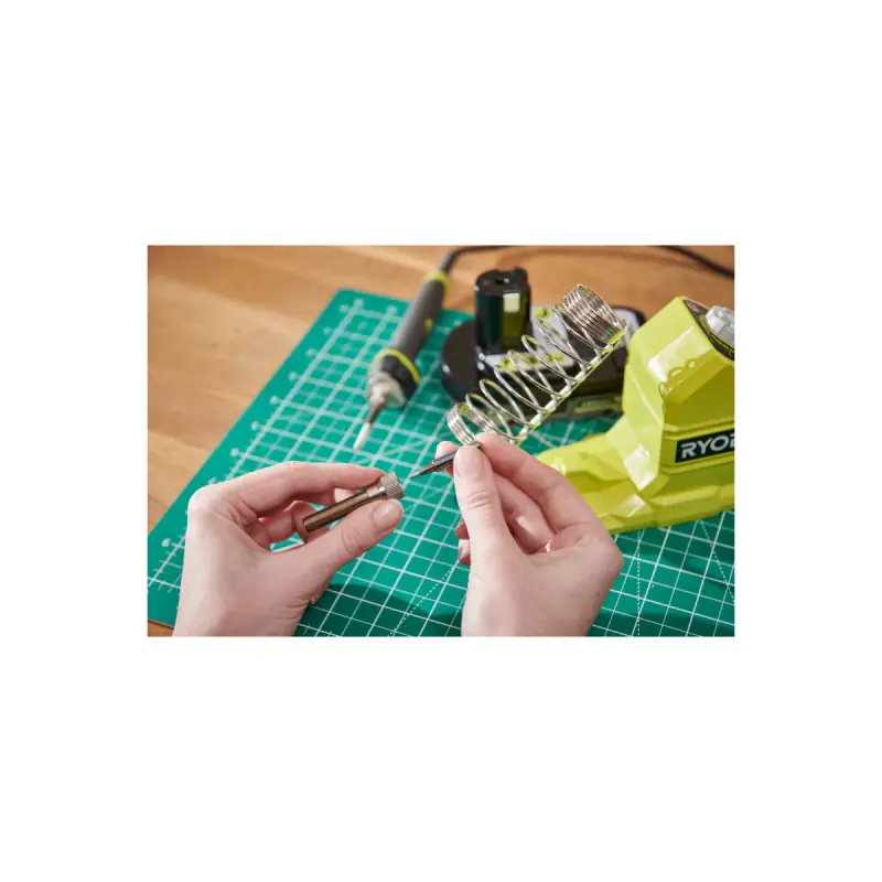 ThisRYOBI soldering iron - RSI18-0 - 18V One+ - Without battery or chargeris ideal for automotive and craft applications. It is easy to use thanks to its pen-style handle. The long 80 cm cord allows for comfortable working, the tool heats up in just 60 seconds and is equipped with an LED light that indicates heating and cooling.