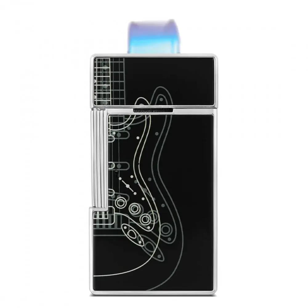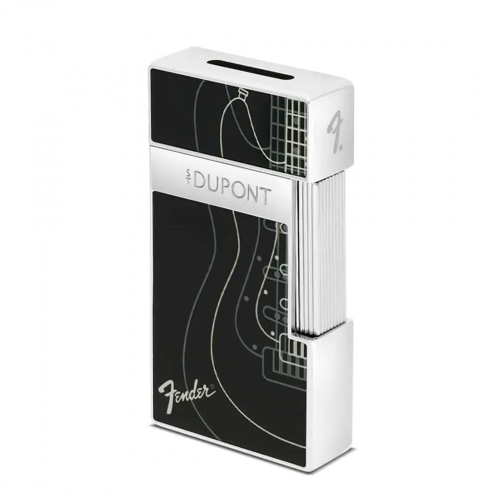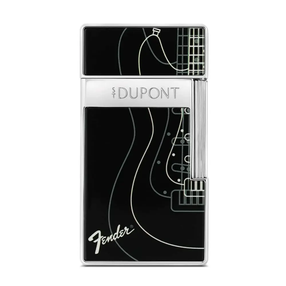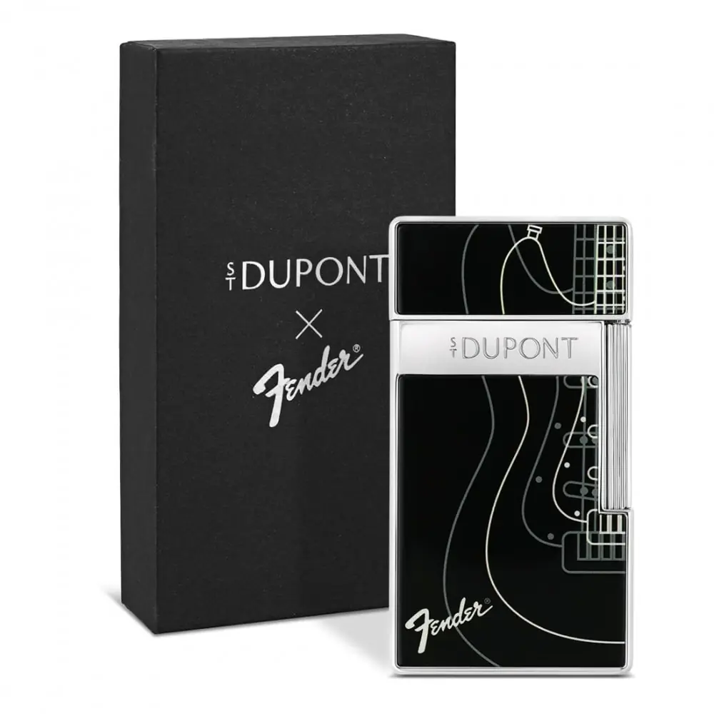 a lighter with a black and chrome design by st dupont in collaboration with fender. special edition torch flame refillable and delivered in a box.