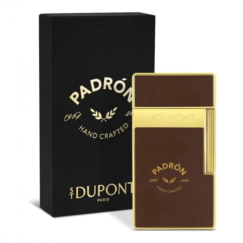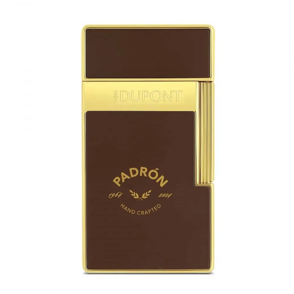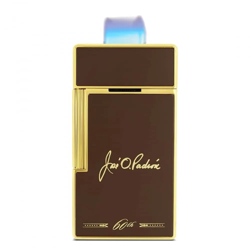 this special edition lighter celebrates the 60th anniversary of the padrón house. with its yellow gold finishes and matte brown lacquer it embodies refinement and excellence. equipped with a 2 cm torch flame it offers precision and elegance.