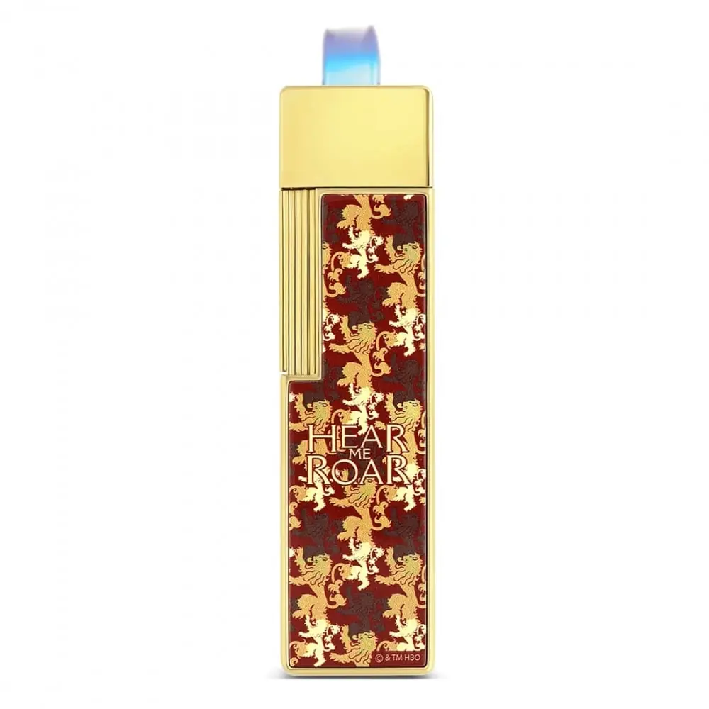 this lighter from the collaboration between st dupont and game of thrones is an elegant and compact model bearing the image of house lannister. adorned with its emblematic emblem the lion and the motto "hear me roar" it has an adjustable blue torch flame perfect for precise use.