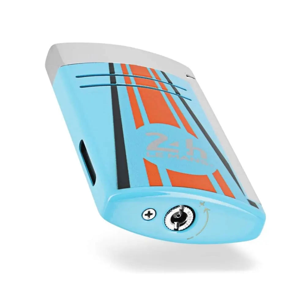 dupont brand lighter displaying a magnificent visual in honor of the famous 24h of le mans car race. this lighter has an electronic ignition with a rigid and wide flame perfect for lighting cigars. blue and orange lighter with chrome parts.