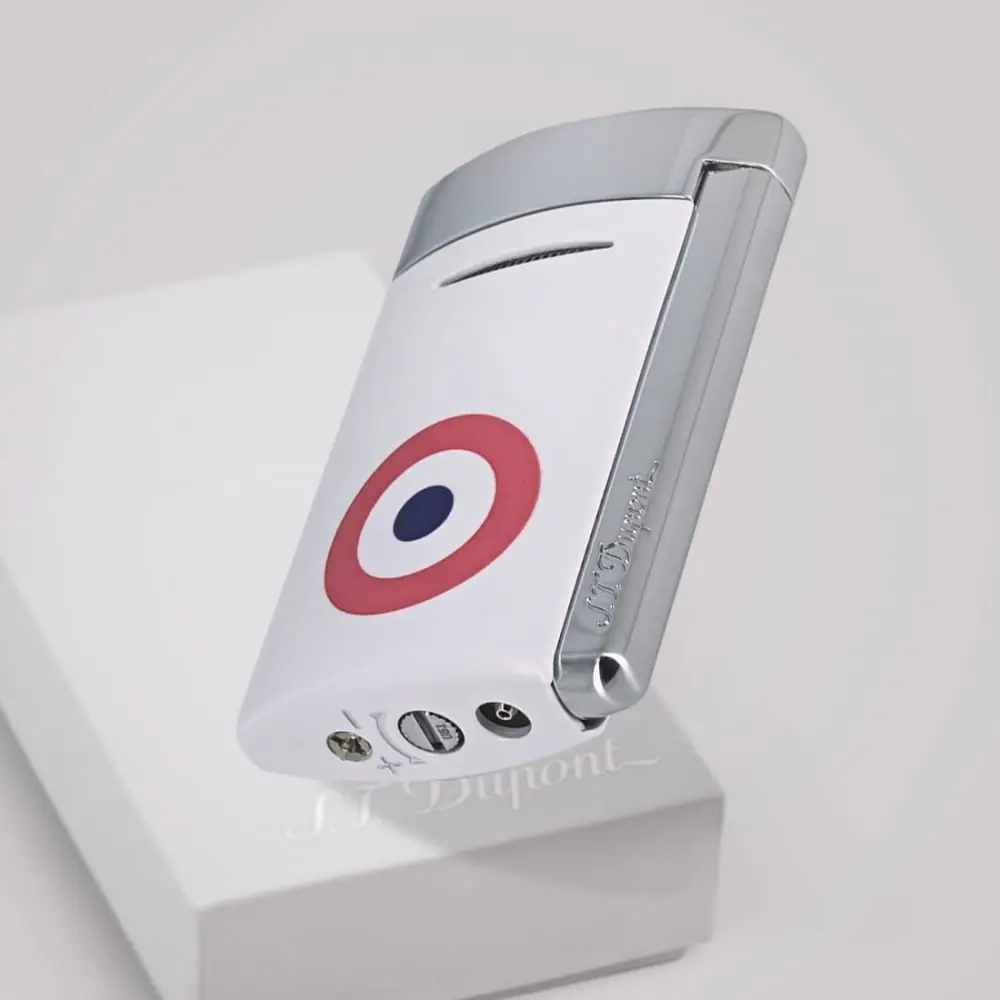 new new minijet white rosette lighter from the famous french brand st dupont pattern: blue and red rosette on a shiny white background chrome ignition button. luxury lighter.
