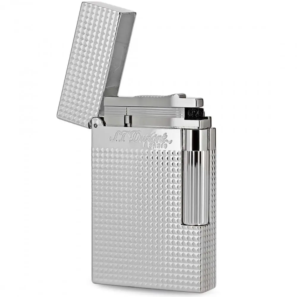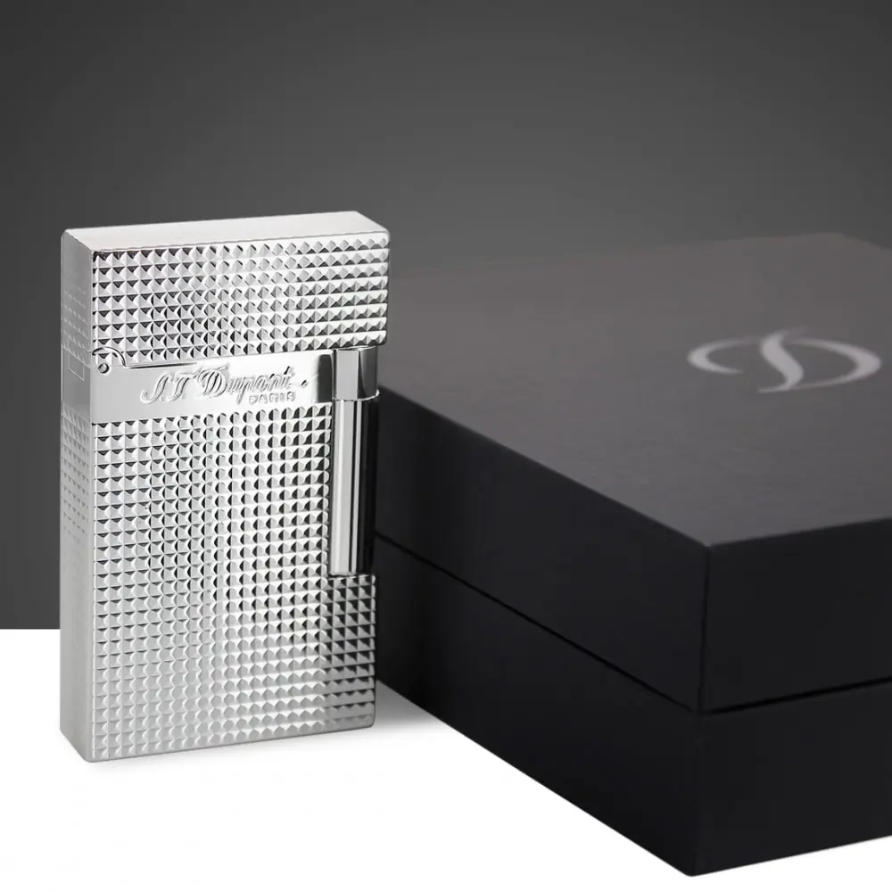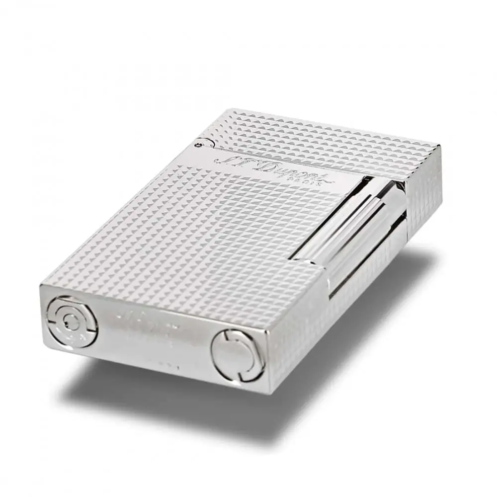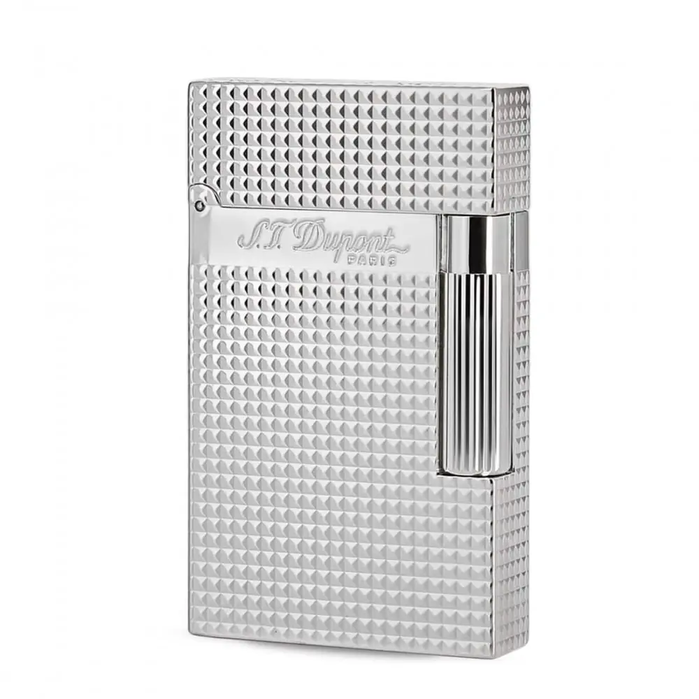 st dupont ligne 2 lighter iconic pattern 1.5 mm diamond tip silver finishes attention to detail the latch and the guilloché trainer are worked with as much meticulousness as the exterior of the product for perfect harmony and unequaled reliability. the flame adjustment and filling rings combine aesthetics and ergonomics. the double flame cigar burner is available for some models (or on request for others). the stdupont signature is engraved on the front face for certain decorations or under the lighter for others.