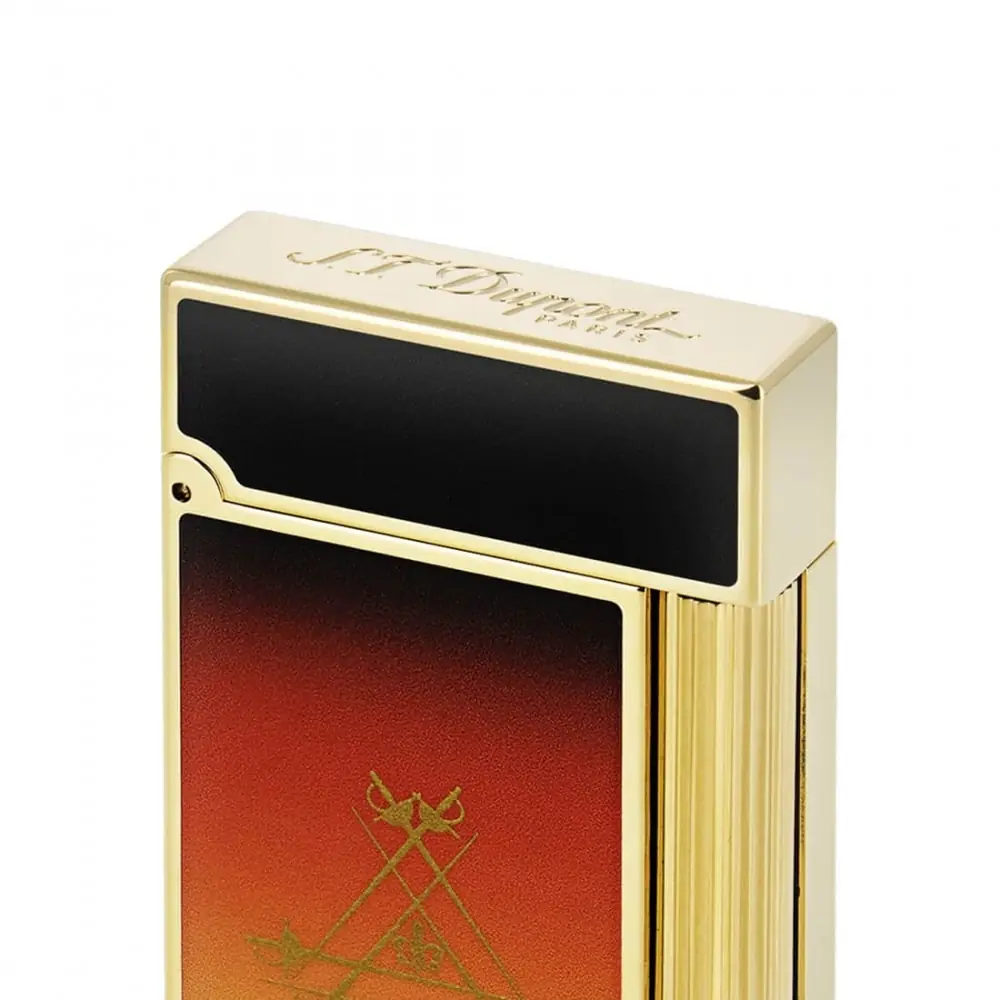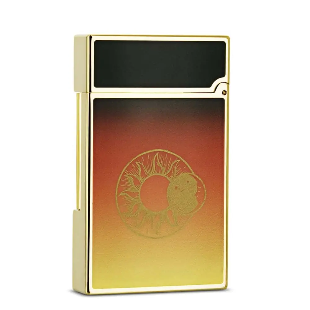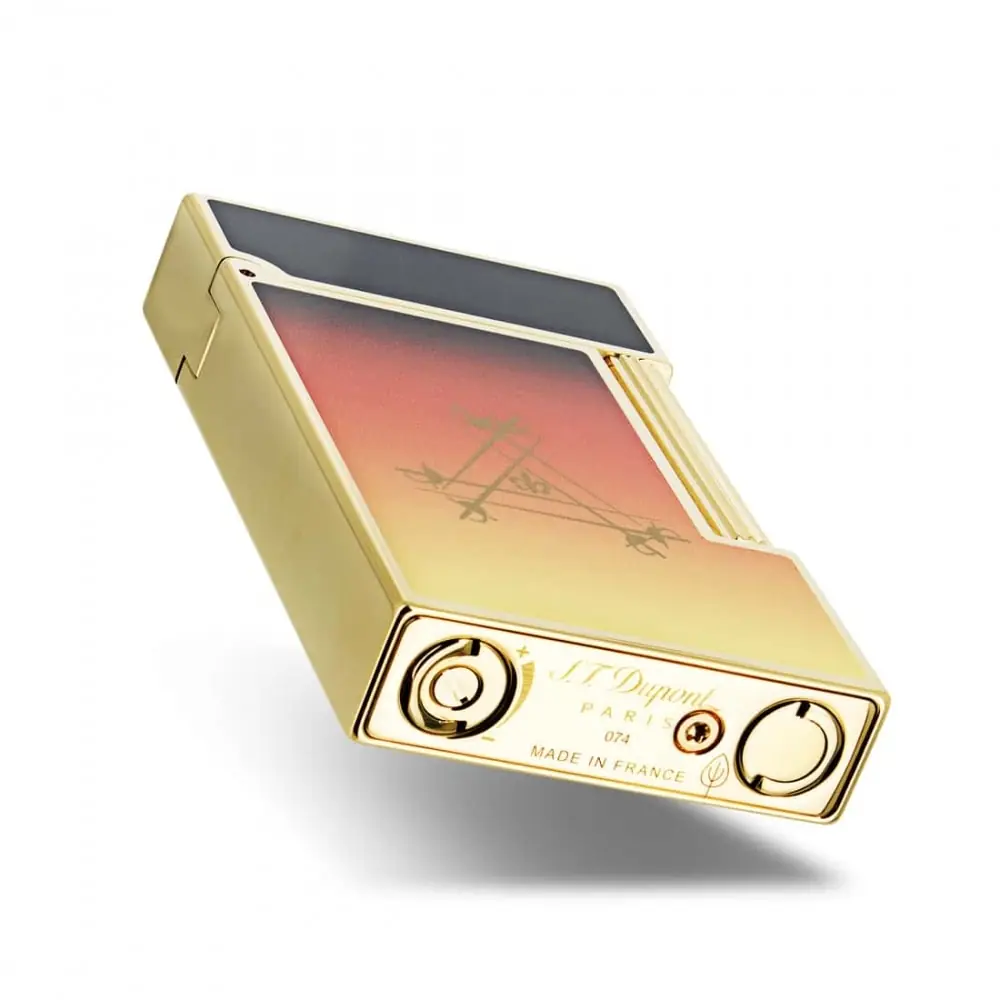 dupont lighter from the ligne 2 range. paying homage to alexandre dumas' novel "the count of montecristo" with here the "le crépuscule" version. in metal and yellow gold colored with a gradient from yellow to brown. features a beautiful flame that can light a cigar.
