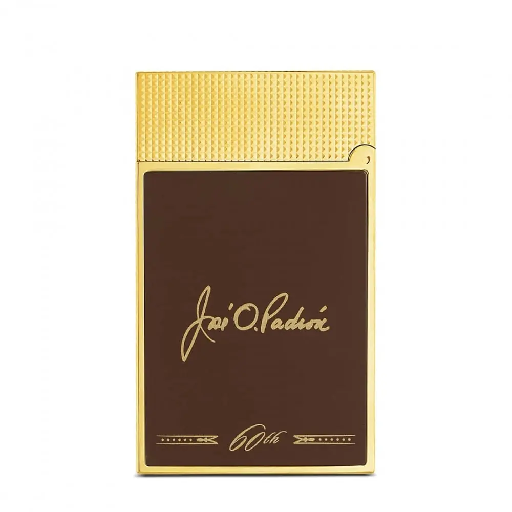 this exceptional lighter box set celebrates the 60th anniversary of the padrón house. the ligne 2 model from st dupont combines a yellow gold finish and a matte brown lacquer. it features the famous double yellow flame and the famous "cling" when opening.