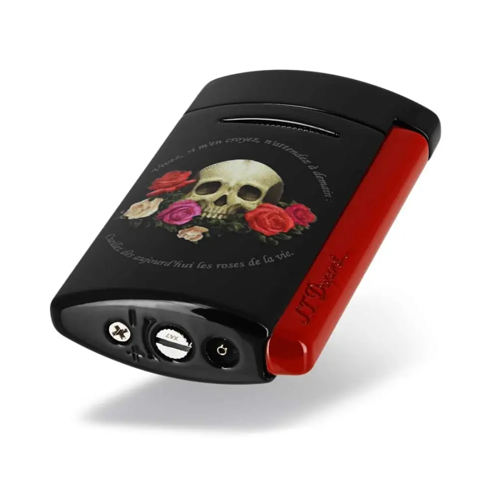 the st dupont new mini jet memento mori black lighter is the ideal accessory for all cigar smokers. this compact storm lighter fits easily into a pants or jacket pocket providing quick and efficient lighting. its unique design is distinguished by a red electronic ignition button a black body and a striking visual of a skull and flowers hence its name "memento mori" which in french means "remember that you you're going to die." around this visual we find the inscription: ?live if you believe me don?t wait until tomorrow: pick the roses of life today?.