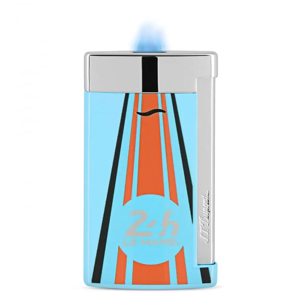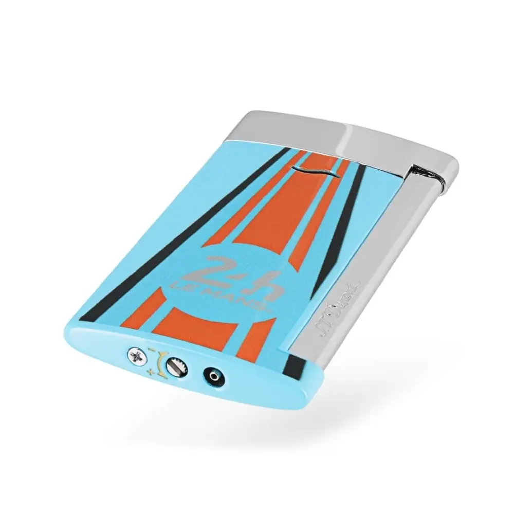 dupont lighter from the slim 7 range the thinnest luxury lighter in the world with only 7 mm thickness. this lighter is a collaboration between the french brand st dupont and the famous 24h of le mans car race. electronic ignition and decorated with the motor racing logo on a blue and orange background.