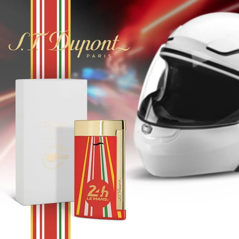 the thinnest luxury lighter in the world with only 7 mm thickness. this lighter is a collaboration between the french brand st dupont and the famous 24h of le mans car race. electronic ignition and decorated with the motor racing logo on a red white yellow and green background.
