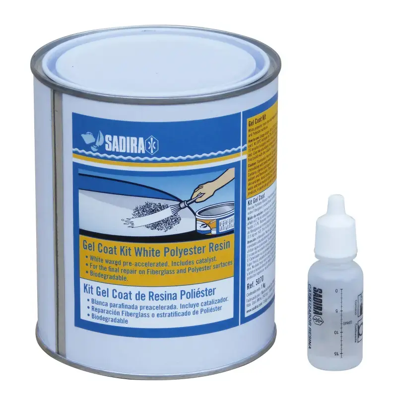 This Sadira white gel coat kit is specially formulated for repairing and finishing fiberglass surfaces on boats. The product includes a catalyst, allowing safe application and quick, uniform curing.