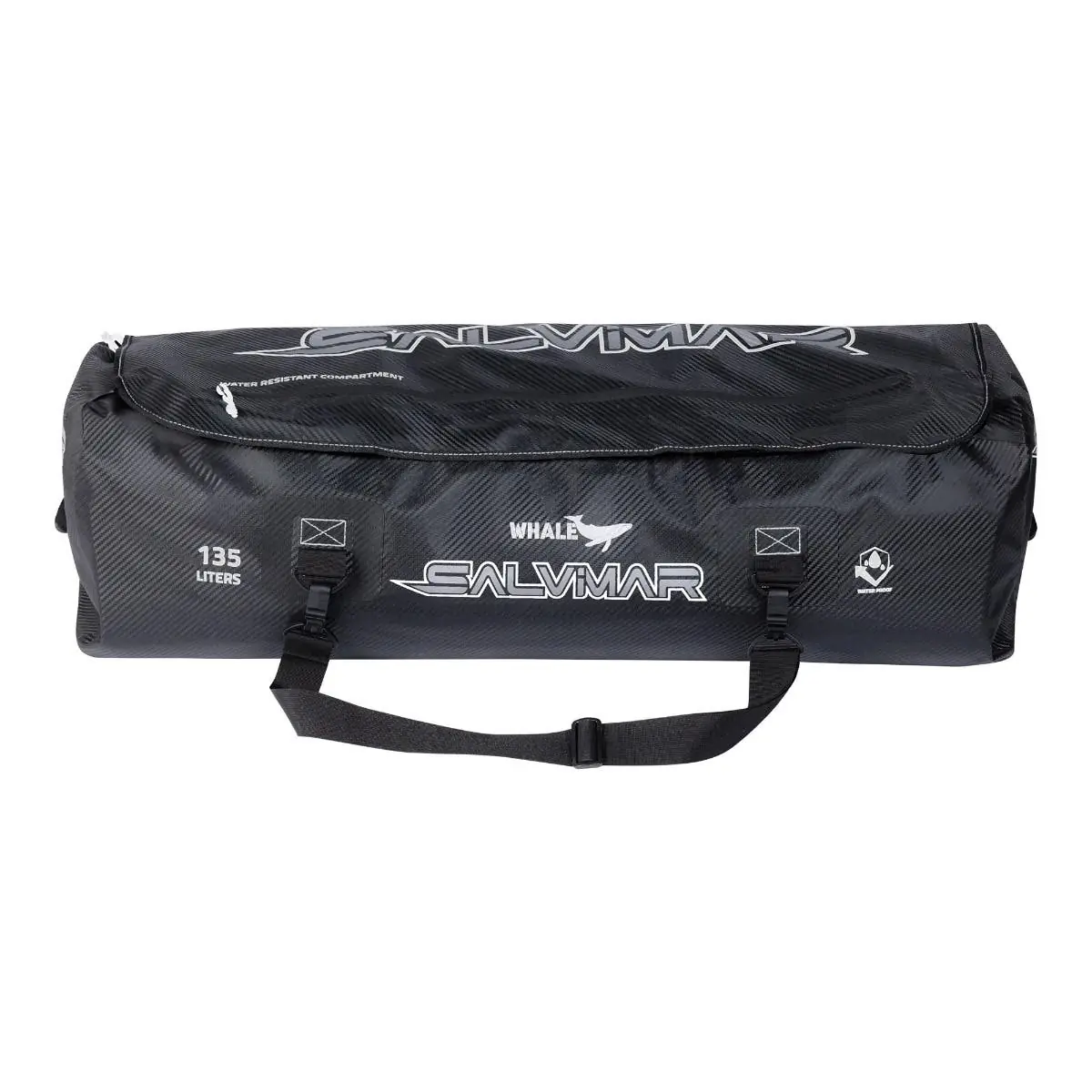 The Salvimar 135L Whale Carbon Waterproof Bag is a high-capacity equipment duffle bag designed for underwater enthusiasts. Crafted from durable, high-frequency welded PVC Tarpaulin, it ensures watertight seams and robust construction. The bag features a valve that allows water to drain after washing equipment inside, maintaining dryness during transport. Its design includes two side handles and adjustable, removable shoulder straps for versatile carrying options. The interior boasts a large mesh compartment for organized storage, while the exterior offers a waterproof top pocket with a water-resistant zipper for additional storage needs.
