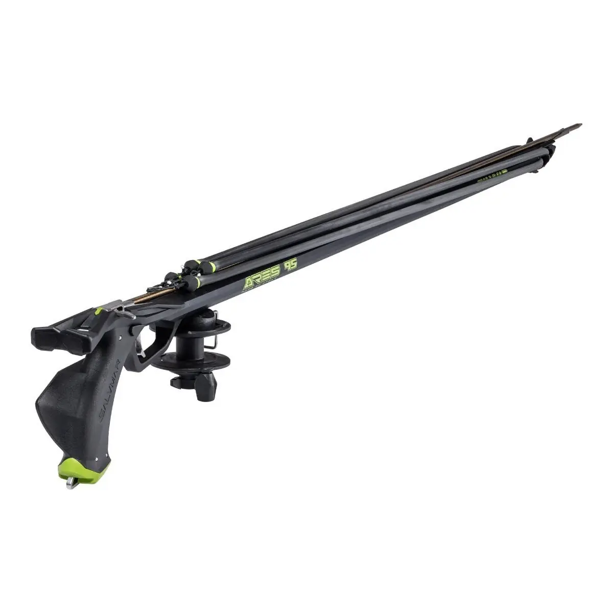 The Salvimar Ares DX Underwater Hunting Crossbow is a high-performance speargun designed for precision and comfort in underwater hunting. It features an elliptical anodized aluminum barrel with external reinforcement ribs, providing exceptional strength and stability. The crossbow is equipped with a full arrow guide, ensuring perfect alignment and accuracy during shots. Its ergonomic right-handed grip enhances handling, and the lowered gun butt optimizes the line of sight for improved aiming.