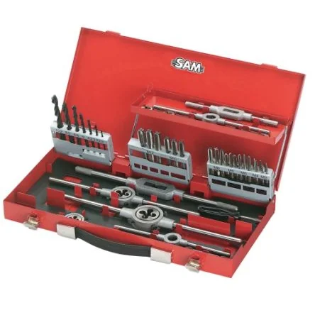 The SAM OUTILLAGE Thread Tap & Die Set or Box of taps and dies of 44 rooms in which it contain 7 sets of 3 taps, 2 left-hand taps, 7 dies, 5 die holder, 1 screwdriver and 1 thread gauge, 7 twist drills and a case with 400 x 205 x 45 mm over all dimensionsMetal case
