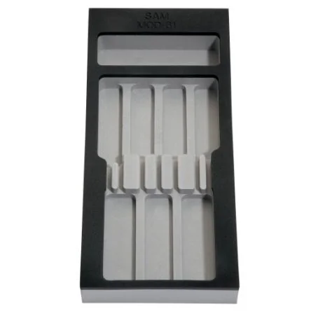 The SAM foam module 1/3 empty for screwdriver is of Foam material. For storage of 7 S1 screwdrivers. Operation with series 30 and 40 trolleys, SERVI-R40 box and PM / PMA series workbench block.It is tough