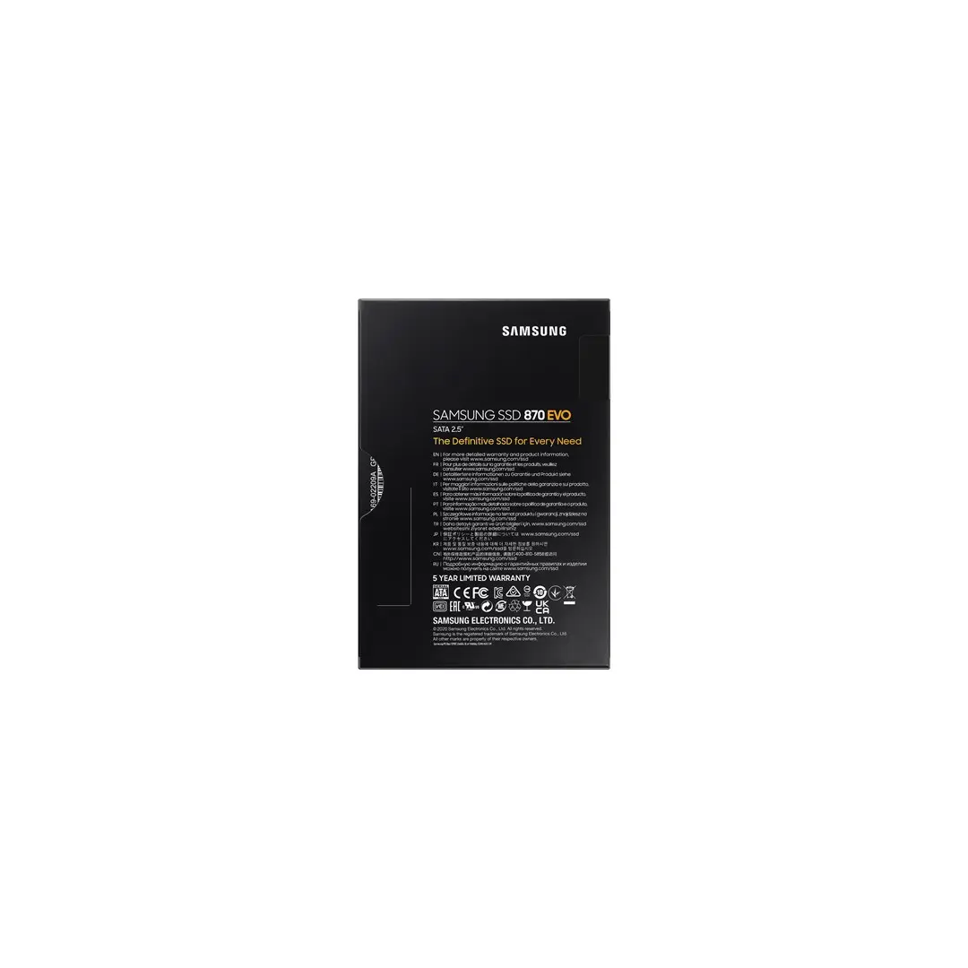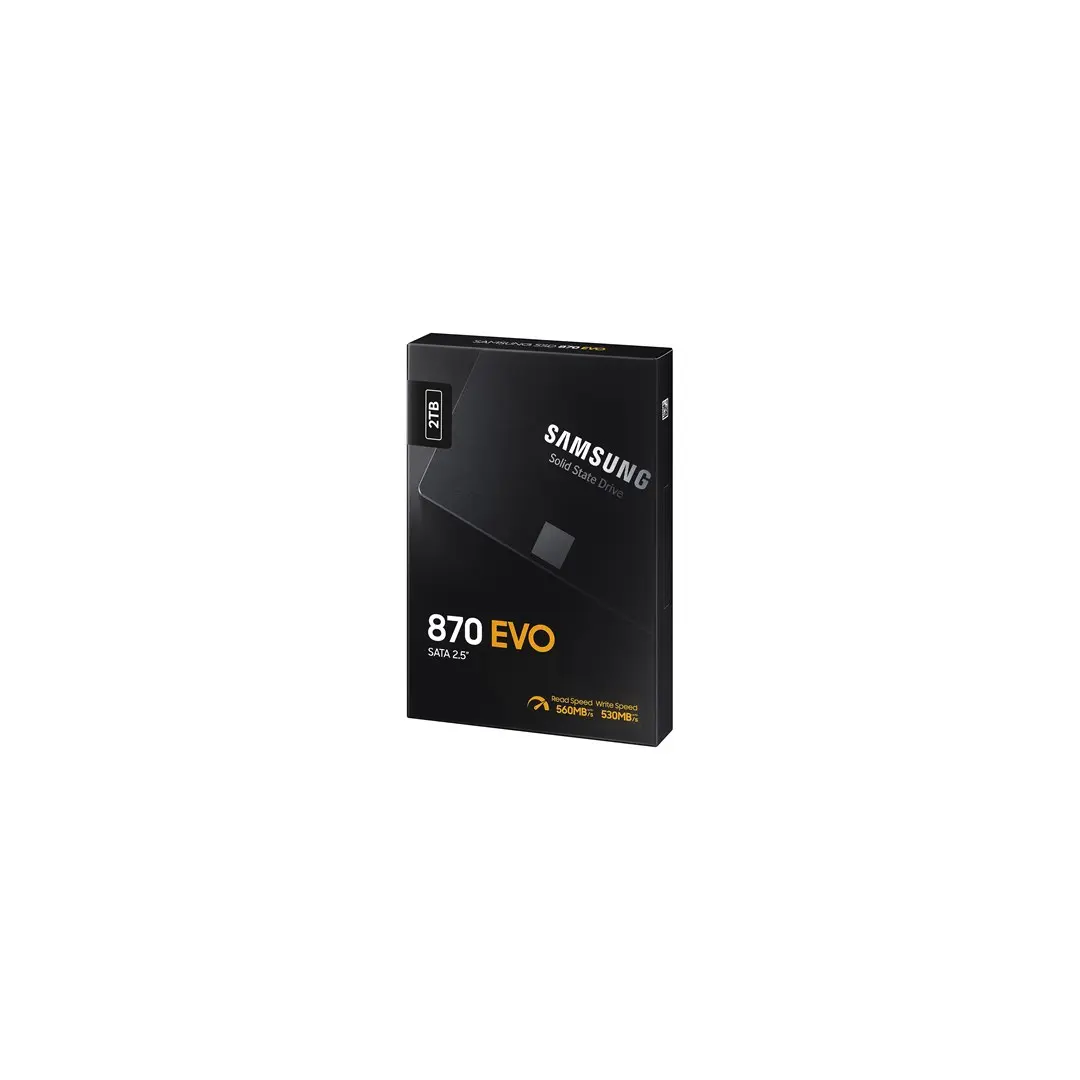 The worlds favourite SSDThe latest model of the worlds best-selling SSD series has finally arrived. The 870 EVO inherits the legacy of Samsungs pioneering SSD technology, boasting upgraded performance, reliability and compatibility to suit the needs of anyone from content creators and IT professionals to everyday users.Excellence in performanceThe 870 EVO achieves the maximum SATA interface limit of 560/530 MB/s sequential speeds. Everyday users can now enjoy professional-level SSD performance. Intelligent TurboWrite accelerates write speeds and maintains long-term high performance with a larger variable buffer.Industry-defining reliabilityProviding up to 2,400 TBW under a 5-year limited warranty, the 870 EVO meets the industrys leading standards of reliability. It withstands tasks from everyday computing to 8K video processing and comes equipped with the latest 6th Gen. VNAND and MKX controller that ensure a stable host experience.More compatible than everThe 870 EVO passed compatibility tests with major host systems and applications, including chipsets, motherboards, NAS and video recording devices. As the latest entry in the globally best-selling EVO series, the 870 EVO‘s proven versatility is compatible with any users systems and tasks.Upgrade with easeUpgrading to the 870 EVO is made easy for anyone with a desktop PC or laptop that supports a standard 2.5-inch SATA form factor. Enjoying this masterpiece SSD is as convenient as plugging in the 870 EVO into a SATA slot and letting the renewed migration software take care of the rest.Samsung Magician softwareMake your drive work like magic. The new and improved Samsung Magician 6 software will keep your SSD in check. You can easily manage your drive with a wide range of useful tools to keep up with the latest updates, monitor the drive's health and status, or even enhance its performance.World's no.1 flash memoryExperience the superior performance and reliability that you can only get from the world's number one brand for flash memory since 2003. All firmware and components, including Samsung's world-renowned DRAM and NAND, are produced in-house, allowing end-to-end integration for quality you can trust.