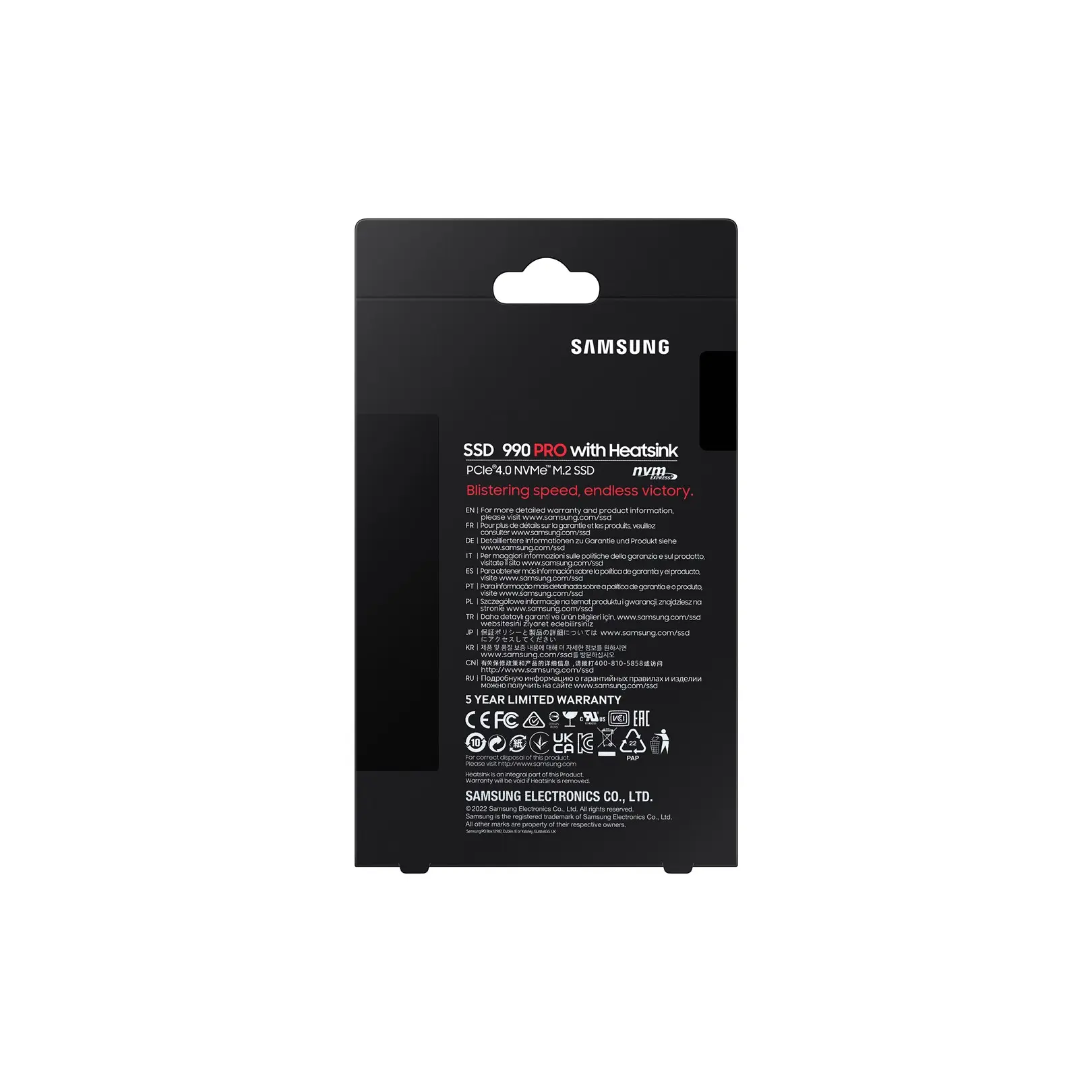 Blistering speed, endless victoryExperience long-lasting fast performance of PCIe® 4.0. The in-house controller's smart heat control delivers supreme power efficiency while maintaining speed and performance to help keep you on the top of your game.PCIe 4.0 speed maximizedHuge speed boost. Up to 40% and 55% faster random read/write speeds than 980 PRO - up to 1400K/1550K IOPS, while sequential read/write speeds up to 7450/6900 MB/s reach near max performance of PCIe® 4.02. Fly high in gaming, video and 3D editing, data analysis, and more.Incredible power efficiencyMore power-efficient performance. Higher performance usually consumes more power. But, 990 PRO uses less power with over 50% improved performance per Watt over 980 PRO3. This low-power design delivers outstanding PCIe® 4.0 performance possible with optimal power efficiency.Smart thermal solutionSink that heat. The slim heatsink helps dissipates heat to prevent performance drops from overheating. Get stable heat control, and minimal fan noise for heavy-graphic gaming. The thin body is compatible with PlayStation® 5, desktops, and laptops meeting the PCI-SIG® D8 standard.The champion makerAn amazing gameplay experience. Huge improvement in random performance enables faster loads for ultimate gaming realism on PS5 and Direct Storage PC games. The heatsink's futuristic design with RGB lights adds style to heat control.Samsung Magician softwareHarness the full power of 990 PRO. Samsung Magician software's user-friendly suite of optimization tools always gets you the best performance out of your Samsung SSD6. Protect data, get updates, monitor drive health, and set up LED color combinations. It's your personal SSD toolkit.World's No. 1 Flash Memory Seller*Experience superior performance and reliability you only get from the world's No.1 flash memory brand since 2003. All components and firmware are produced in-house, including Samsung's world-renowned DRAM and NAND, for integrated start-to-finish quality you can trust.