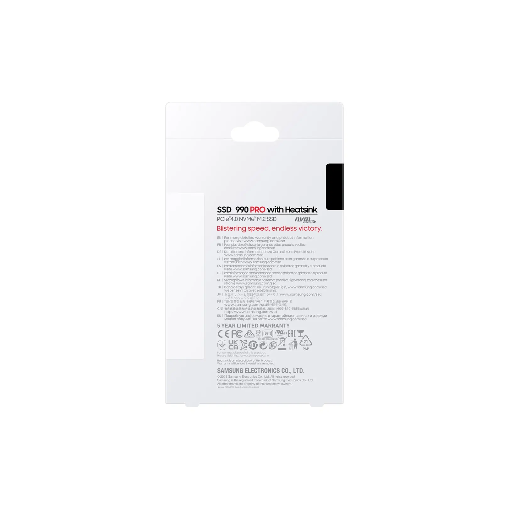 Superb SSD for gaming enthusiastsReach max performance of PCIe® 4.0.Experience longer-lasting, opponent-blasting speed. The in-house controller's smart heat control delivers supreme power efficiency while maintaining ferocious speed and performance, to always keep you at the top of your game.PCIe 4.0 speed maximisedHuge speed boost. 40% and 55% faster random read/write speeds than 980 PRO - up to 1400K/1550K IOPS, while sequential read/write speeds up to 7450/6900 MB/s reach near max performance of PCIe® 4.0. Fly high in gaming, video and 3D editing, data analysis, and more.Improved power efficiencyHigher performance often consumes more power. Not with the 990 PRO. Experience low power consumption with over 50% improved performance per watt over the previous model, 980 PRO.Smart thermal solutionSink that heat. The slim heatsink dissipates heat to prevent performance drops from overheating. Get stable heat control, and minimal fan noise for heavy-graphic gaming. The thin body is compatible with PlayStation® 5, desktops and laptops meeting the PCI-SIG® D8 standard.Game like a proSecure victory with 990 PRO with Heatsink's expanded 4TB capacity, empowering you with a random read speed ofup to 1,600.000 IOPS. Witness faster loading times on your PC and PlayStation® 5, as it breathes life into your games.Samsung Magician softwareUnlock the full power of 990 PRO. Samsung Magician software's user-friendly suite of optimisation tools always gets you the best SSD performance. Protect data, get updates, monitor drive health, and set up LED colour combinations. Your personal SSD toolkit.World's No. 1 Flash MemoryExperience superior performance and reliability you only get from the world's No.1 flash memory brand since 2003. All components and firmware are produced in-house, including Samsung's world-renowned DRAM and NAND, for integrated start-to-finish quality you can trust.