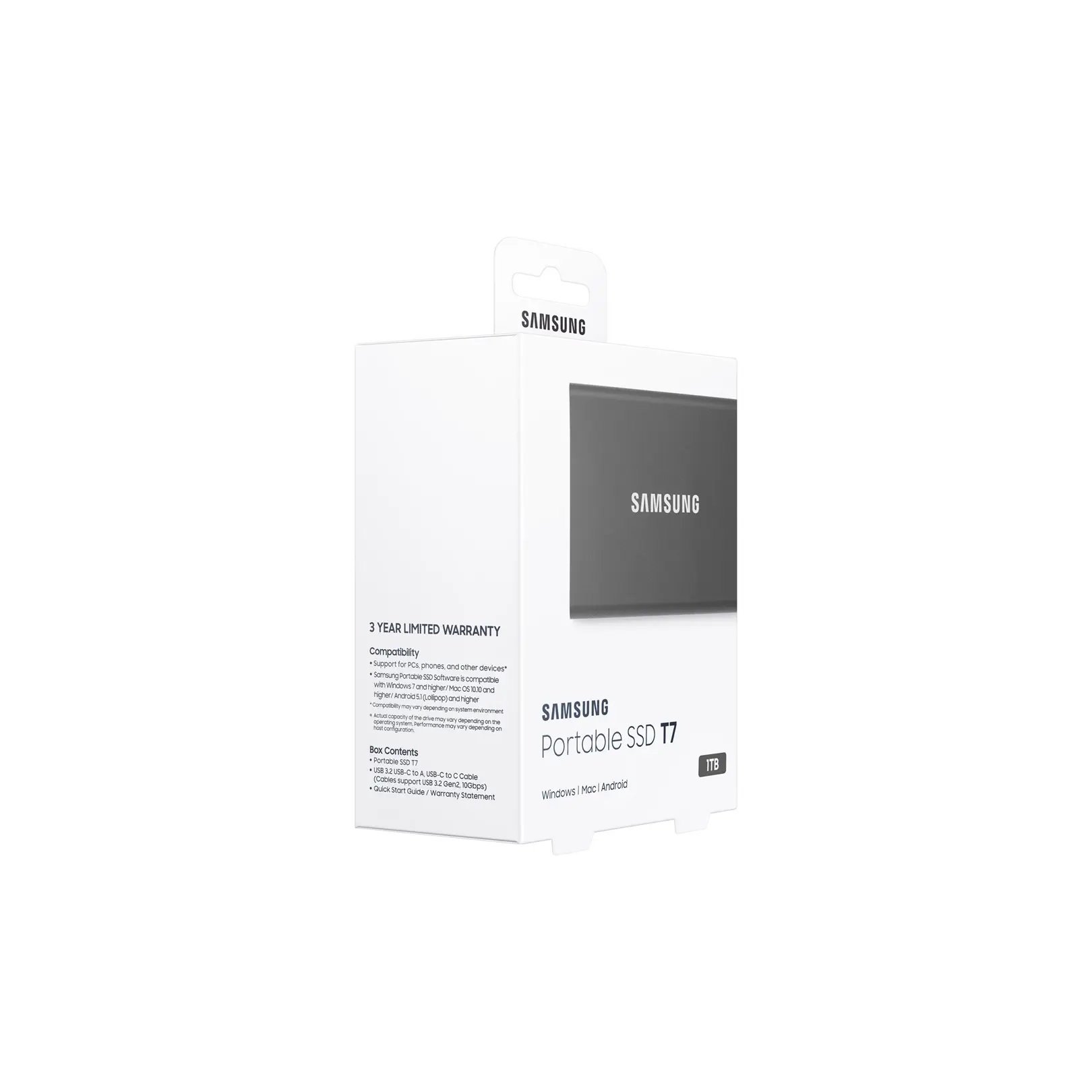 Transfer in a flashFeaturing sequential read/write speeds of up to 1,050 MB/s and 1,000 MB/s, the T7 can transfer massive files in mere seconds via its USB 3.2 Gen 2 interface to give your workflow a much-needed boost.Compact design with colossal capacityStore it all on a credit card-size drive with capacity from 1TB to 4TB in choice of blue or grey.Compatible with multiple devicesBundled with USB Type C-to-C and Type C-to-A cables for added convenience, the T7 minimises disruption, letting users switch seamlessly between Windows®, macOS®, smartphones, tablets or game consoles.Capture longer, save instantlyProlong your smartphone filmmaking with T7's excellent power efficiency. Capture and store 4K smartphone filming data simultaneously with T7. Enable instant editing with effortless T7 connection to your laptop or PC.Sophisticated thermal solutionUse T7 without worrying about overheating. The T7's advanced thermal solution uses the Dynamic Thermal Guard to withstand and control heat, so the compact SSD stays at an optimal temperature even at fast speeds.Built strong and secureThe T7 can be secured with an AES 256-bit encrypted password and is encased in a sturdy metal body that keeps data intact from falls of up to 2 meters. The T7 is confidently backed by a 3-year limited warranty.Samsung Magician softwareUnlock the full power of T7 with Samsung Magician software - a user-friendly suite of optimisation tools that facilitate the best portable SSD performance. Protect valuable data, monitor drive health, and get the latest firmware updates.Bringing innovations to lifeFor decades, Samsungs NAND flash memory has powered groundbreaking technologies that have changed every part of our daily lives. This NAND flash technology also powers our consumer SSDs, making room for the next big push of innovation.Lightning-fast transfer speedsWith up to 1,050 MB/s transfer speed, the T7 puts you full speed ahead at work or play.Extensive compatibilityFreely switch between devices during your workflow without disruption.Sleek and compact styleEffortlessly transfer vast data with the light and compact T7.