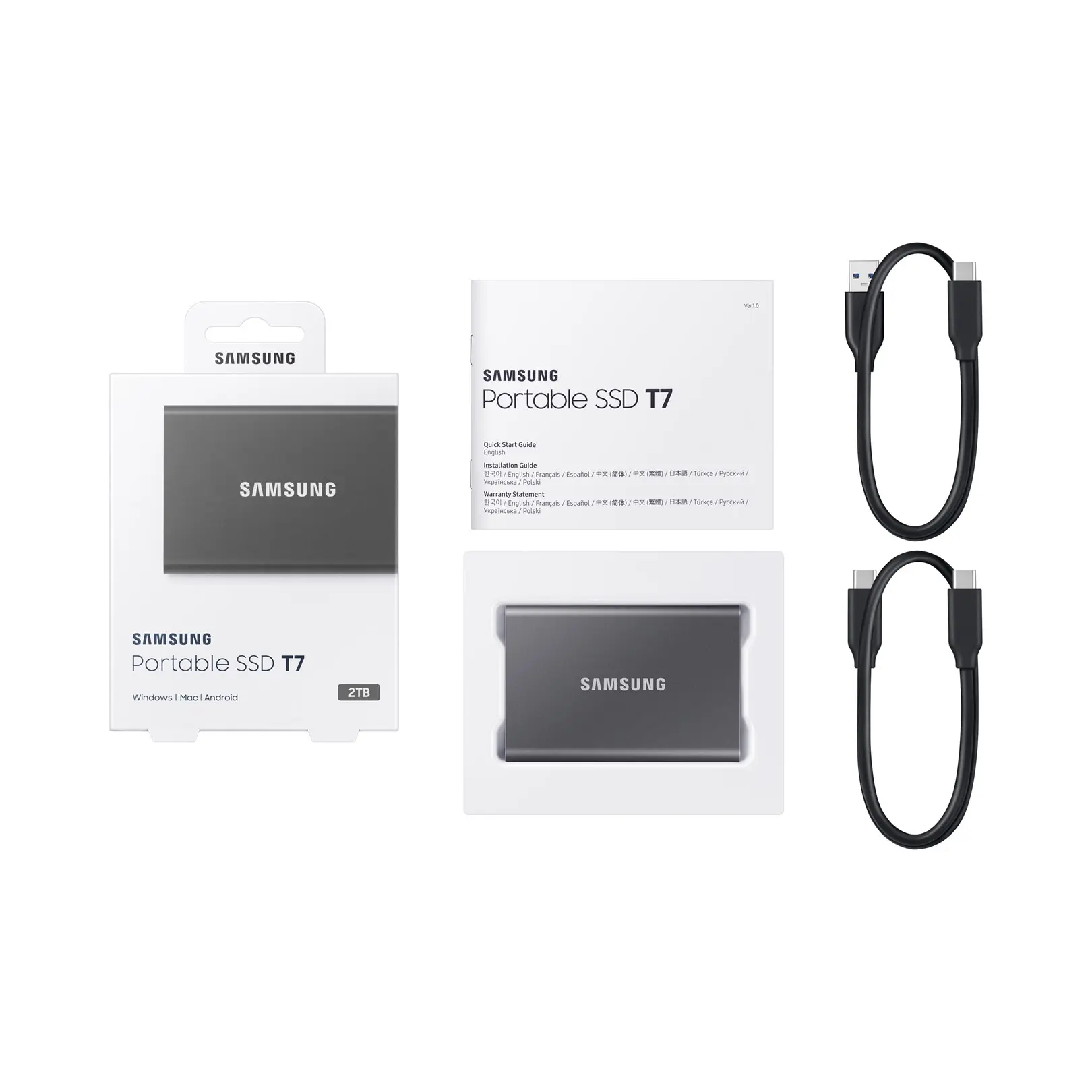 Transfer in a flashFeaturing sequential read/write speeds of up to 1,050 MB/s and 1,000 MB/s, the T7 can transfer massive files in mere seconds via its USB 3.2 Gen 2 interface to give your workflow a much-needed boost.Compact design with colossal capacityStore it all on a credit card-size drive with capacity from 1TB to 4TB in choice of blue or grey.Compatible with multiple devicesBundled with USB Type C-to-C and Type C-to-A cables for added convenience, the T7 minimises disruption, letting users switch seamlessly between Windows®, macOS®, smartphones, tablets or game consoles.Capture longer, save instantlyProlong your smartphone filmmaking with T7's excellent power efficiency. Capture and store 4K smartphone filming data simultaneously with T7. Enable instant editing with effortless T7 connection to your laptop or PC.Sophisticated thermal solutionUse T7 without worrying about overheating. The T7's advanced thermal solution uses the Dynamic Thermal Guard to withstand and control heat, so the compact SSD stays at an optimal temperature even at fast speeds.Built strong and secureThe T7 can be secured with an AES 256-bit encrypted password and is encased in a sturdy metal body that keeps data intact from falls of up to 2 meters. The T7 is confidently backed by a 3-year limited warranty.Samsung Magician softwareUnlock the full power of T7 with Samsung Magician software - a user-friendly suite of optimisation tools that facilitate the best portable SSD performance. Protect valuable data, monitor drive health, and get the latest firmware updates.Bringing innovations to lifeFor decades, Samsungs NAND flash memory has powered groundbreaking technologies that have changed every part of our daily lives. This NAND flash technology also powers our consumer SSDs, making room for the next big push of innovation.Lightning-fast transfer speedsWith up to 1,050 MB/s transfer speed, the T7 puts you full speed ahead at work or play.Extensive compatibilityFreely switch between devices during your workflow without disruption.Sleek and compact styleEffortlessly transfer vast data with the light and compact T7.
