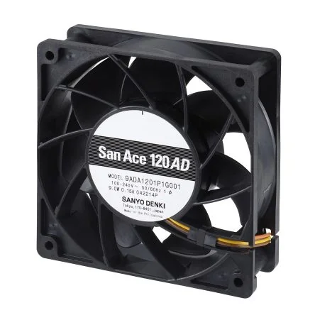 High-performance Sanyo Denki axial fan with 3.9m³/min airflow for versatile AC/DC operation.