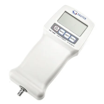 Measuring instrument with Euro-plug charger and 6 standard mountings, hook, pressure plate, pressure peaks and 90 mm extension. FK Series Force Gauge, Digital. Digital force gauge for easy measurement of tractive and compressive forces Measurement frequency 1000 Hz Measurement accuracy ±0.5%, overload protection for 200% of final value Display rotatable through 180 °, with indicator in N, kg, lb and oz Peak hold function for recording max. measured force, track function for continuous measurement Suitable for use with all Sauter test stands