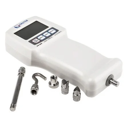 Measuring instrument with Euro-plug charger and 6 standard mountings, hook, pressure plate, pressure peaks and 90 mm extension. FK Series Force Gauge, Digital. Digital force gauge for easy measurement of tractive and compressive forces Measurement frequency 1000 Hz Measurement accuracy ±0.5%, overload protection for 200% of final value Display rotatable through 180 °, with indicator in N, kg, lb and oz Peak hold function for recording max. measured force, track function for continuous measurement Suitable for use with all Sauter test stands