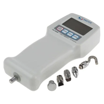 Measuring instrument with Euro-plug charger and 6 standard mountings, hook, pressure plate, pressure peaks and 90 mm extension. FK Series Force Gauge, Digital. Digital force gauge for easy measurement of tractive and compressive forces Measurement frequency 1000 Hz Measurement accuracy ±0.5%, overload protection for 200% of final value Display rotatable through 180 °, with indicator in N, kg, lb and oz Peak hold function for recording max. measured force, track function for continuous measurement Suitable for use with all Sauter test stands