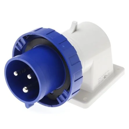 Durable blue wall mount power plug rated at 32A, perfect for industrial use.