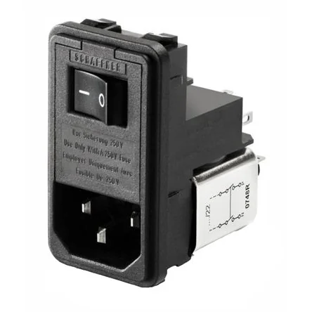 UL recognised component, VDE, CSA certified, SEMKO. Snap-in and screw mount versions available. Schaffner FN380 Series. The FN 380 power entry module combines an IEC inlet, a mains filter with a single or dual fuse holder and a 2-pole rocker switch. A wide selection on amperage ratings, fuse options, mounting possibilities and filters for medical applications are designed to offer you the desired solution. Can be used in a wide range of applications such as portable electrical and electronic equipment, consumer goods, EDP ; office equipment, single-phase power supplies, switch-mode power supplies, test ; measurement equipment and medical equipment. Up to 6A current ratings IEC 950-compliant (twin fuse configurations only) General purpose applications Rear/front or snap-in mounting Single or dual-fuse holder 2-pole rocker switch