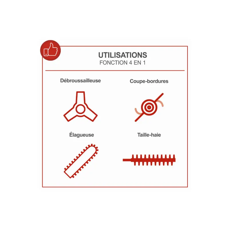 With the SCHEPPACH PRO-CUT 4 in 1 Multi-Function Tool - 1.8 Hp - Harness - MFH5200-4P Pro, you can clear, trim, prune, and cut as you wish. This gardening tool has the advantage of multiple functionalities to provide you with better versatility when maintaining your green space. Thanks to an anti-vibration design, you can work for long periods comfortably. Additionally, a harness is provided for better handling and enhanced comfort.