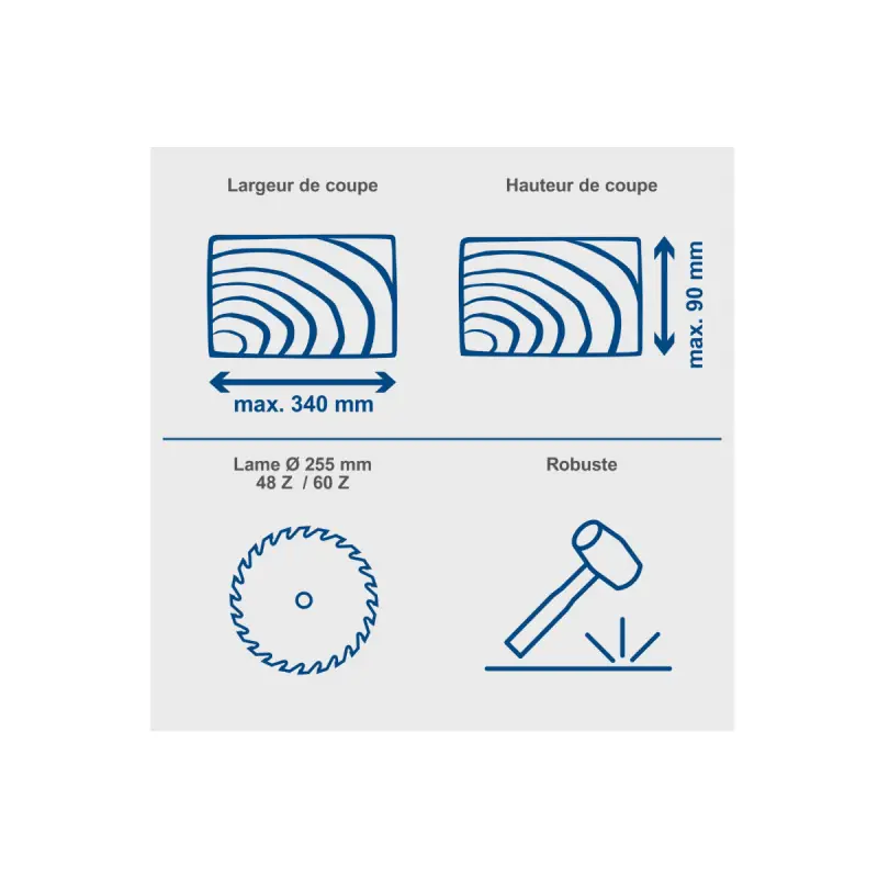 - Blade: 255 mm and 60 teeth (48 teeth blade also included)
