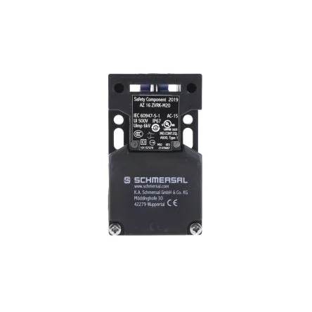 Schmersal Safety Interlock SwitchThe Schmersal AZ16 series, standard, simple, machine guard safety interlock switch has 1NC/1NO contacts. Its housing has 4 entry points: 1 on the front, 1 in the rear, and 2 on the top. The housing material is glass fibre reinforced thermoplastic. It has a maximum voltage rating of 230VAC/24VDC and a maximum current rating of 4A.Features and BenefitsIndividual coding available on request Long life Double insulated 3 cable entries M20 x 1.5 Large wiring compartment High level of contact reliability with low voltages and currents Not sensitive to dirty conditions by virtue of patented roller system Slotted holes for adjustment, circular holes for locationCertificationsIEC/EN60947-5-1 BG-GS-ET-15 IP67 rated BG certified UL listed CSA certified EAC certified CCC certified