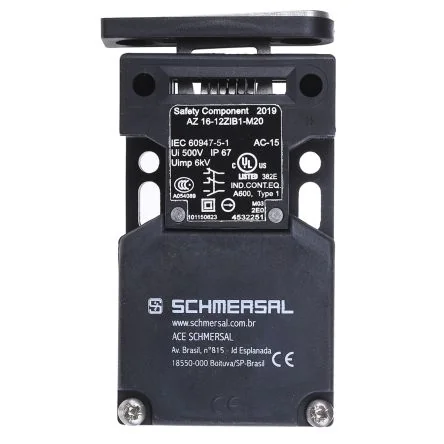 Schmersal Safety Interlock SwitchThe Schmersal AZ16 series, standard, simple, machine guard safety interlock switch has 2NC/1NO contacts. Its housing has 4 entry points: 1 on the front, 1 in the rear, and 2 on the top. The housing material is glass fibre reinforced thermoplastic. It has a maximum voltage rating of 230VAC/24VDC and a maximum current rating of 4A.Features and BenefitsIndividual coding available on request Long life Double insulated 3 cable entries M20 x 1.5 Large wiring compartment High level of contact reliability with low voltages and currents Not sensitive to dirty conditions by virtue of patented roller system Slotted holes for adjustment, circular holes for locationCertificationsIEC/EN60947-5-1 BG-GS-ET-15 IP67 rated BG certified UL listed CSA certified EAC certified CCC certified
