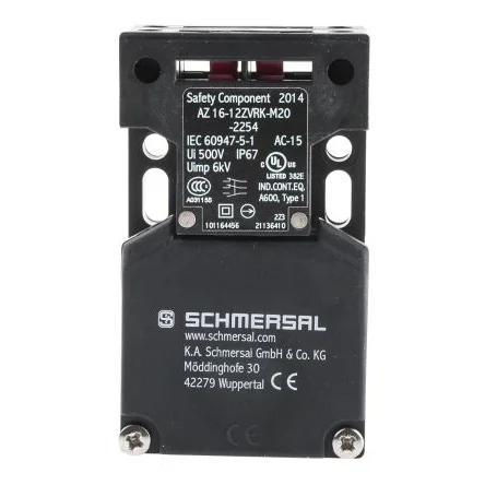 Schmersal Safety Interlock SwitchThe Schmersal AZ16 series, standard, simple, machine guard safety interlock switch has 1NO/2NC contacts. Its housing has 4 entry points: 1 on the front, 1 in the rear, and 2 on the top. The housing material is glass fibre reinforced thermoplastic. It has a maximum voltage rating of 230VAC/24VDC and a maximum current rating of 4AFeatures and BenefitsIndividual coding available on request Long life Double insulated 3 cable entries M20 x 1.5 Large wiring compartment High level of contact reliability with low voltages and currents Not sensitive to dirty conditions by virtue of patented roller system Slotted holes for adjustment, circular holes for locationCertificationsIEC/EN60947-5-1 BG-GS-ET-15 IP67 rated BG certified UL listed CSA certified EAC certified CCC certified
