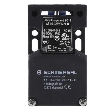 Schmersal Safety Interlock SwitchThe Schmersal AZ16 series, standard, simple, machine guard safety interlock switch has 2NC contacts. Its housing has 4 entry points: 1 on the front, 1 in the rear, and 2 on the top. The housing material is glass fibre reinforced thermoplastic. It has a maximum voltage rating of 230VAC/24VDC and a maximum current rating of 4A.Features and BenefitsIndividual coding available on request Long life Double insulated 3 cable entries M20 x 1.5 Large wiring compartment High level of contact reliability with low voltages and currents Not sensitive to dirty conditions by virtue of patented roller system Slotted holes for adjustment, circular holes for locationCertificationsIEC/EN60947-5-1 BG-GS-ET-15 IP67 rated BG certified UL listed CSA certified EAC certified CCC certified