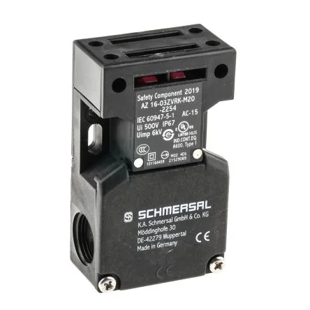 Schmersal Safety Interlock SwitchThe Schmersal AZ16 series, standard, simple, machine guard safety interlock switch has 3NC contacts. Its housing has 4 entry points: 1 on the front, 1 in the rear, and 2 on the top. The housing material is glass fibre reinforced thermoplastic. It has a maximum voltage rating of 230VAC/24VDC and a maximum current rating of 4A.Features and BenefitsIndividual coding available on request Long life Double insulated 3 cable entries M20 x 1.5 Large wiring compartment High level of contact reliability with low voltages and currents Not sensitive to dirty conditions by virtue of patented roller system Slotted holes for adjustment, circular holes for locationCertificationsIEC/EN60947-5-1 BG-GS-ET-15 IP67 rated BG certified UL listed CSA certified EAC certified CCC certified