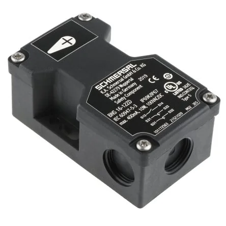 Schmersal Non-Contact Safety SwitchThe Schmersal BNS16 series non-contact safety switch has a safe switch ON distance of 8mm and switch OFF distance of 18mm. This switch has 1NO and 2NC contacts. It has a black thermoplastic enclosure and can be concealed mounted as well. Note: Actuating magnet not included Caution: EN60947-5-3 standard is only met if the entire system consisting of a safety sensor (BNS16), magnet (BPS16) and safety-monitoring module (AES) is used.Features and BenefitsSupply voltage rating is 100VAC/DC Front (cover) directions of actuation Insensitive to transverse misalignment Long life No mechanical wear Insensitive to transverse misalignment Insensitive to soiling Individual contact outlet Three cable entries of M 20 x 1.5CertificationsIP67 rated BG certified EAC certified IEC/EN60947-5-3 BG-GS-ET-14 CE certified