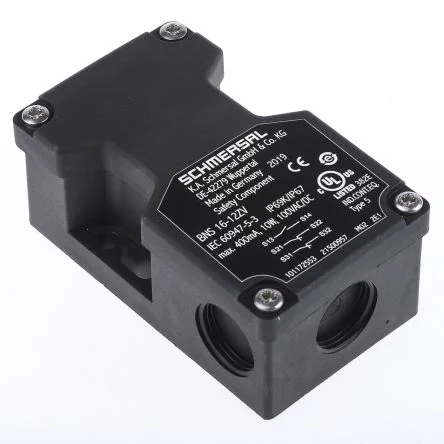 Schmersal Non-Contact Safety SwitchThe Schmersal BNS16 series non-contact safety switch has a safe switch ON distance of 8mm and switch OFF distance of 18mm. This switch has 1NO and 2NC contacts. It has a black thermoplastic enclosure and can be concealed mounted as well. Note: Actuating magnet not included Caution: EN60947-5-3 standard is only met if the entire system consisting of a safety sensor (BNS16), magnet (BPS16) and safety-monitoring module (AES) is used.Features and BenefitsSupply voltage rating is 100VAC/DC Axial directions of actuation Insensitive to transverse misalignment Long life No mechanical wear Insensitive to transverse misalignment Insensitive to soiling Individual contact outlet Three cable entries of M 20 x 1.5CertificationsIP67 rated BG certified EAC certified IEC/EN60947-5-3 BG-GS-ET-14 CE certified