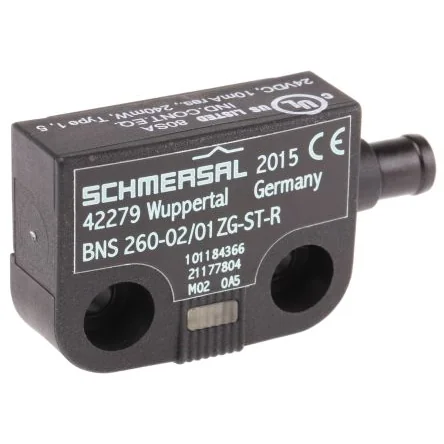 Schmersal Non-Contact Safety SwitchThe Schmersal BNS260 series non-contact safety switch has a safe switch ON distance of 5mm and switch OFF distance of 15mm. This switch has 2NC contacts and an actuation magnet. It has a black thermoplastic enclosure and can be concealed mounted as well. Note: Actuating magnet not included, see accessories Caution: EN60947-5-3 standard is only met if the entire system consisting of a safety sensor (BNS260), magnet (BPS260) and safety-monitoring module (AES) is used.Features and BenefitsSupply voltage rating is 24VDC Insensitive to transverse misalignment Long life No mechanical wear Insensitive to soiling Individual contact outletCertificationsIP67 rated BG certified EAC certified IEC/EN60947-5-3 BG-GS-ET-14