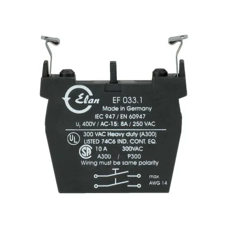 The Schmersal EF033.1 Contact element EF has a plastic, glass-fibre reinforced thermoplastic enclosure material and is self-extinguishing. It has a screw connection and mounting flange position 1. It is suitable for EMERGENCY-OFF and has 13-14 23-24 contact labelling.Standards: EN 60947-5-1, IEC/EN 60947-1 Mechanical life, minimum: 10,000,000 Operations Protection class of the Switch rooms: IP40 Protection class of Clips or Terminals: IP20