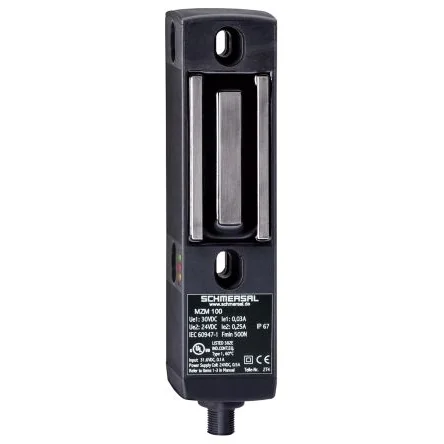 EN ISO 13849-1, IEC 61508, IEC 60947-5-3, EN 60947-5-1. BG, cULus. Actuator must be ordered separately, stock no. ; 880-1909 880-1909. Stock no. ; 880-1918 880-1918 is a target for variable setting of L/Force. Stock no. ; 880-1911 880-1911 is a mounting kit (screws included). Schmersal MZM100 Solenoid Interlock Switch. The MZM100 Safety switch from Schmersal has a solenoid interlock without a positive-linked mechanical locking mechanism. It uses an electromagnet to generate a 500-N holding force and then transmits the signal interlock locked to the safety-monitoring module. The forced-closed operating principle of the MZM100 switch offers multiple advantages. Mechanical wear becomes a thing of the past because of the absence of moving parts. The actuator and the locking mechanism are free from play and therefore neutralise undesired noises, even on machines with high vibrations. Despite the absence of play between actuator and interlock, the system tolerates large door misalignments. The smooth surfaces of actuator and interlock furthermore provide for the simplicity of cleaning. An integrated sensor, functioning according to the patented pulse-echo operating principle from Schmersal, detects and monitors the position of the safety guard. Multiple safety switchgear can be monitored by means of one safety-monitoring module, without detriment to the safety level, saving money and clearing space in the control cabinet. The MZM100 fulfils the requirements of control category 4 to EN 954-1 or SIL 3 to IEC 61508 and the magnetic locking principle complies, amongst others, with EN 60947-5-1. Because of its compact size, the MZM100 can be fitted on conventional 40 mm machine profiles. It is suitable for light safety guards on packaging and wrapping machines thanks to its insensitivity to vibration, and is ideal for use in the food-processing industry because it has no surfaces, where dust and dirt can gather. Automatic latching Solenoid interlocks (for the protection of people) with innovating and unique operating principle Dimensions 40 x 179 x 40 mm Electronic contact-free, coded system Thermoplastic enclosure Maximum length of the sensor chain 200 m 3 LEDs to show operating conditions Sensor technology permits an offset between actuator and interlock of ± 5 mm vertically and ± 3 mm horizontally Intelligent diagnosis Self-monitoring series-wiring of 31 sensors IP67 to IEC/EN 60529