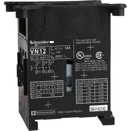 The Schneider Electric VN20 is a TeSys mini-Vario switch body, 3 poles, for motor switching applications. It provides capability to have mounted until 2 add-on modules, connection by screw terminals, mounting on DIN-rail or by screw fixing. To be equipped with an handle to form an operational switch-disconnector, several models of handles are available. Add-on modules (main pole, neutral pole, earthing module, auxiliary contacts) and mounting accessories are available (to be ordered separately).IP degree of protection IP20 Mercury free