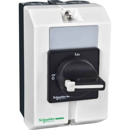 TeSys enclosed starter with switch disconnector, 3 poles, for main switching in motor applications up to 5.5kW@400V AC-2. Enclosure providing IP65 protection, fitted with a black rotary handle and black front plate, pad lockable (padlocks not included). It includes a 3-pole Vario switch body V01 with 2 possible add-on module attachments. Surface mounting enclosure with screw fixing, 2 knock-outs for cable glands on top and bottom, sealable cover.IP degree of protection IP65 Mercury free