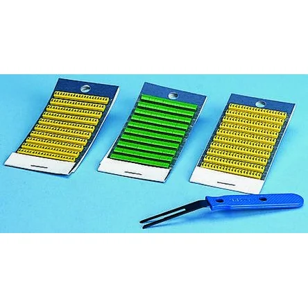 Marker rings and tabs. Range of marker rings for markers and marker tabs. The range is split into two series: - a series of rings with letters - a series of rings with numbers Marker rings featuring both letters and numbers are also available. The lettered and numbered series also include 400 earthing rings (200 green and 200 yellow), 200 symbols +, 200 symbols - and a positioning tool. Yellow background colour. A quick marker ring positioning tool is available separately. Standard: NF C 93-011