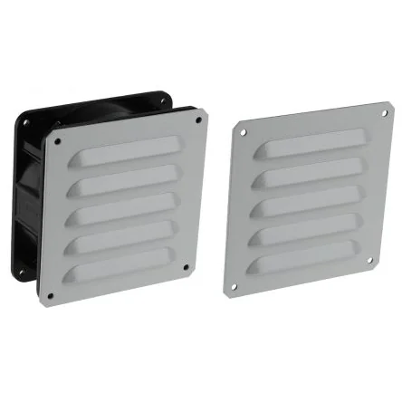 IP33 ventilation kit. Ventilation kit comprising: - 1 ventilator 120 x 120 38 mm, 230 V - 50 / 60 Hz, free flow rate of 170 m³/h, IP33 / IK10,- 2 metal eyelets 120 x 120 mm, grey RAL 7032, - 2 anti-insect grills 115 x 98 mm, stainless steel wire, Ø 0.32 mm braided, 1.07 mm mesh, - 1 power cord, - screws. Assembly flow rate: 54 m³/h. Protection index IP33 and IK10.