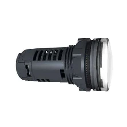 Reliable white LED pilot light for industrial signaling, designed for easy panel mounting.