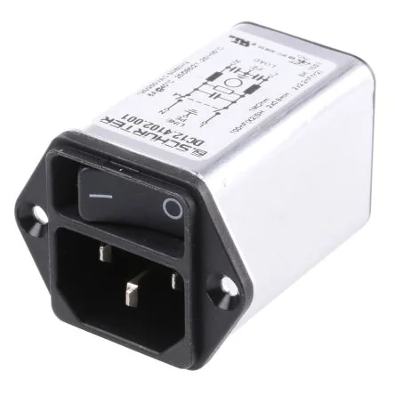 For use in equipment according to IEC/UL 60950. Medical versions are suitable for use in medical equipment according to IEC/UL 60601-1. DC12 Series. The DC12 series of power entry modules from Schurter are a high performance IEC inlet with line filter and line switch. The DC12 inlets are equipped with a 'V-Lock' notch intended for use with the latching cordset. These IEC filters have a compact design and are available in white or black. The DC 12 series has a switch for high inrush current. Features and Benefits:. Different mounting options available - screw on from front or rear and snap-in from front. Rear side mounting enables an efficient, cost saving assembly. 6.3 x 0.8 mm quick connect terminals. Line switch. Compact size. Excellent shielding. Single elements are already wired. Standard and medical versions are available. Illuminated and non-illuminated line switch options. Available in black or white. Product Applications:. DC12 power entry modules are suitable for applications with high transient loads. These IEC inlets can be used for appliance inlet protection (Class I or II), a 1 or 2 pole line switch or as a line filter for standard or medical applications.