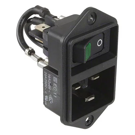Fuse Holders must be ordered separately. EC11 Series. Schurter EC11 series C20 power entry modules come in two versions. They are both panel mount but the user has a choice of either screw-on or snap-in versions. The screw-on can be mounted and secured from the front and rear side whilst the snap-in is mounted from the front side only. The EC11 series offer two functions, appliance inlet protection class I and II and a line switch for either 1 or 2 poles. 6.3 x 0.8mm quick connect terminals Ultra-compact design All single elements are already wired Line switch non-illuminated or illuminated Ideal for application with high transient loads Suitable for use in equipment according to IEC/UL 60950