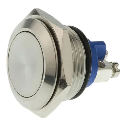 Signal Switching Push-button Switch. Stainless steel momentary pushbutton switch Panel sealed to IP65 Screw terminals Contact rating: 50mA @ 24V d.c. Minimum switching voltage: 50mV d.c. Contact resistance: 10mO Gold contacts Mechanical life 500000 operations Electrical life 300000 operations Depth behind panel 33, max. panel thickness 6mm, panel cut-out 18mm
