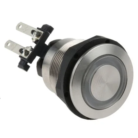ENEC, UL, CSA. Point illuminated types require suitable series resistor; Ring illuminated types incorporate resistors for 24Vdc operation. Anti-Vandal M19 ; M22 Push Button Switches - MSM LA Series (Latching). Robust pushbutton switch suitable for use in harsh environments - IK07 shock resistance (DIN EN 50102) IP64 sealed stainless steel housing and latching (push-on, push-off) actuator Actuator with 10N operating force and 4.5mm travel - protrudes 3.7mm above panel in off state Quick connect terminals Long life - up to 150,000 mechanical operations Non-illuminated or red, green or blue LED point or ring illuminated versions, available in 19 or 22mm Ø panel cut outs Switching status optically visible - illuminated viewing angle of 180°