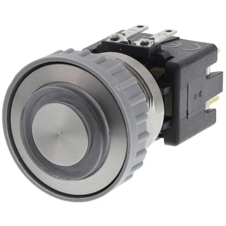 Durable illuminated push button switch with green LED, ideal for harsh environments.